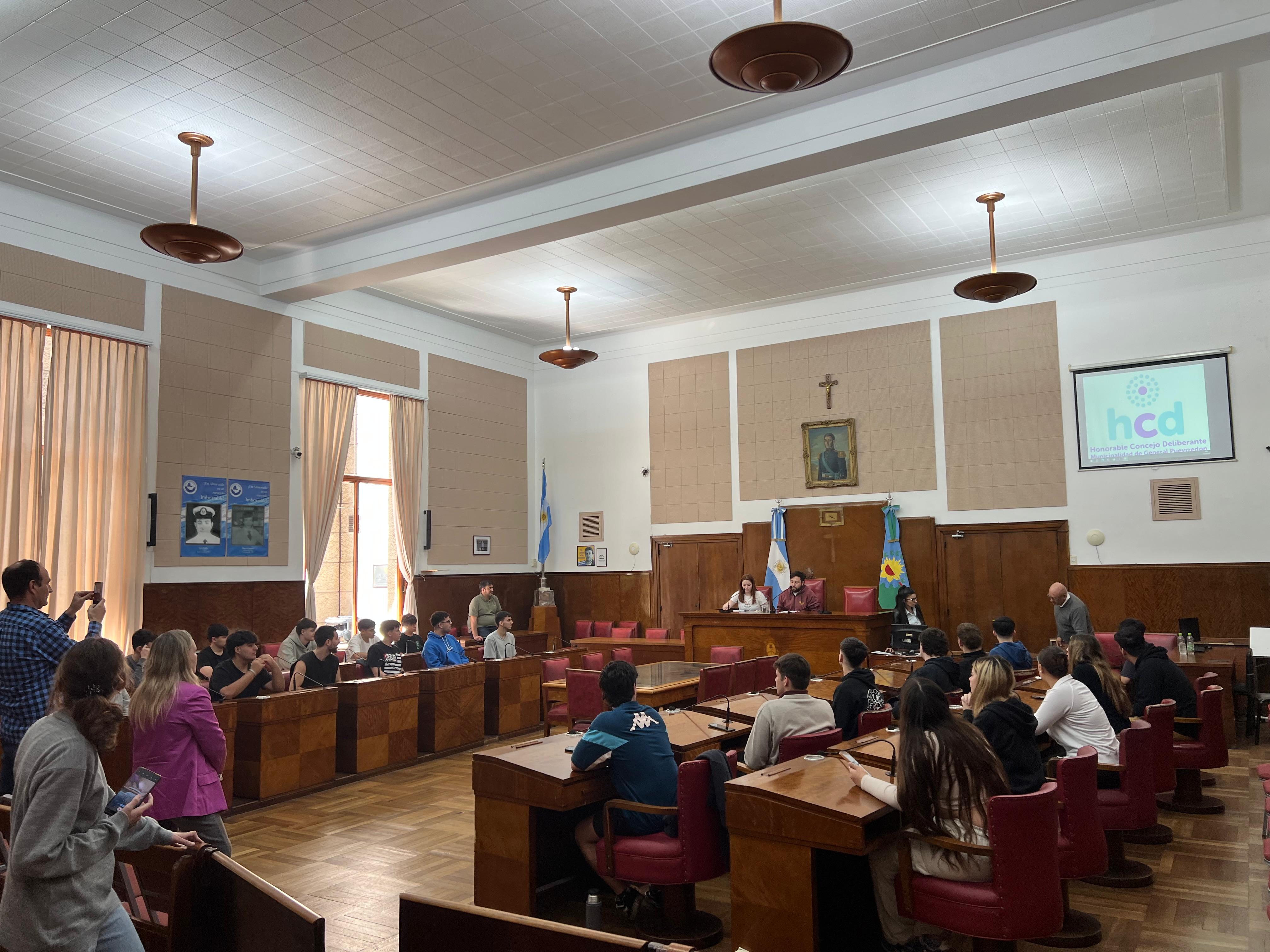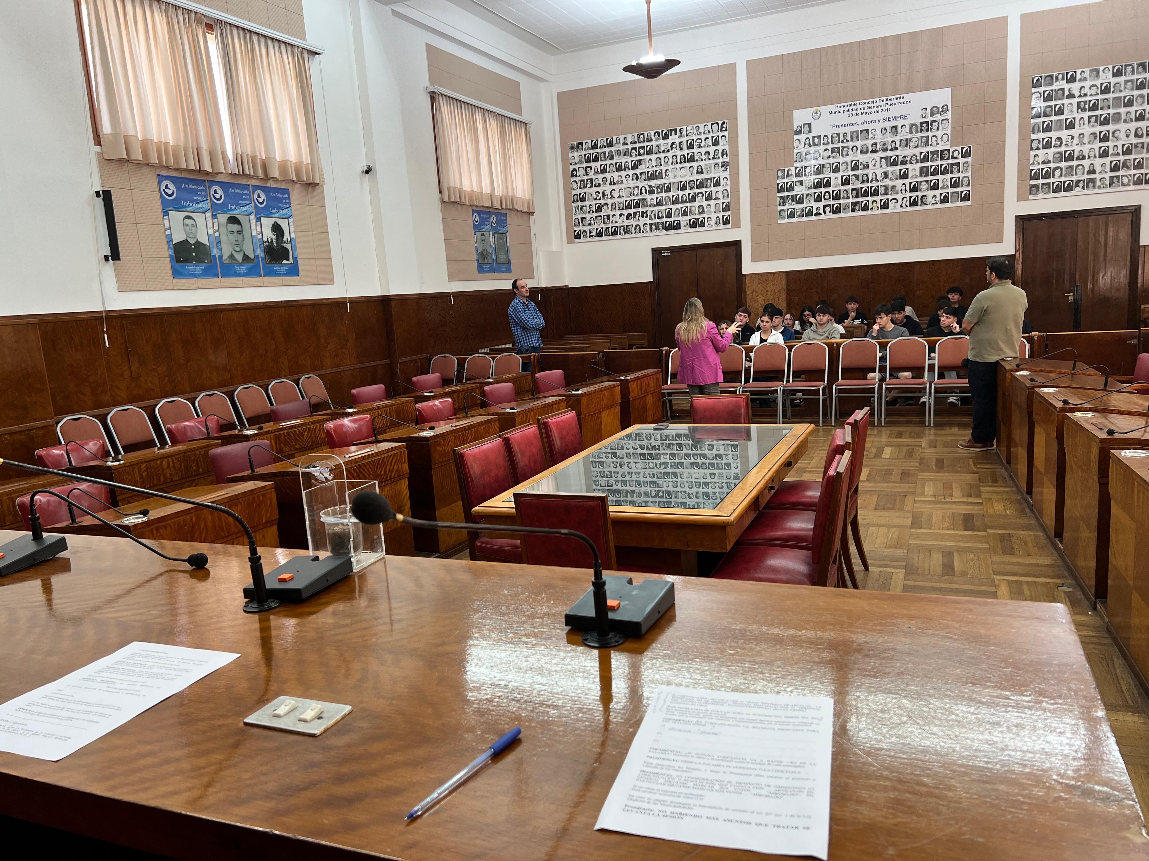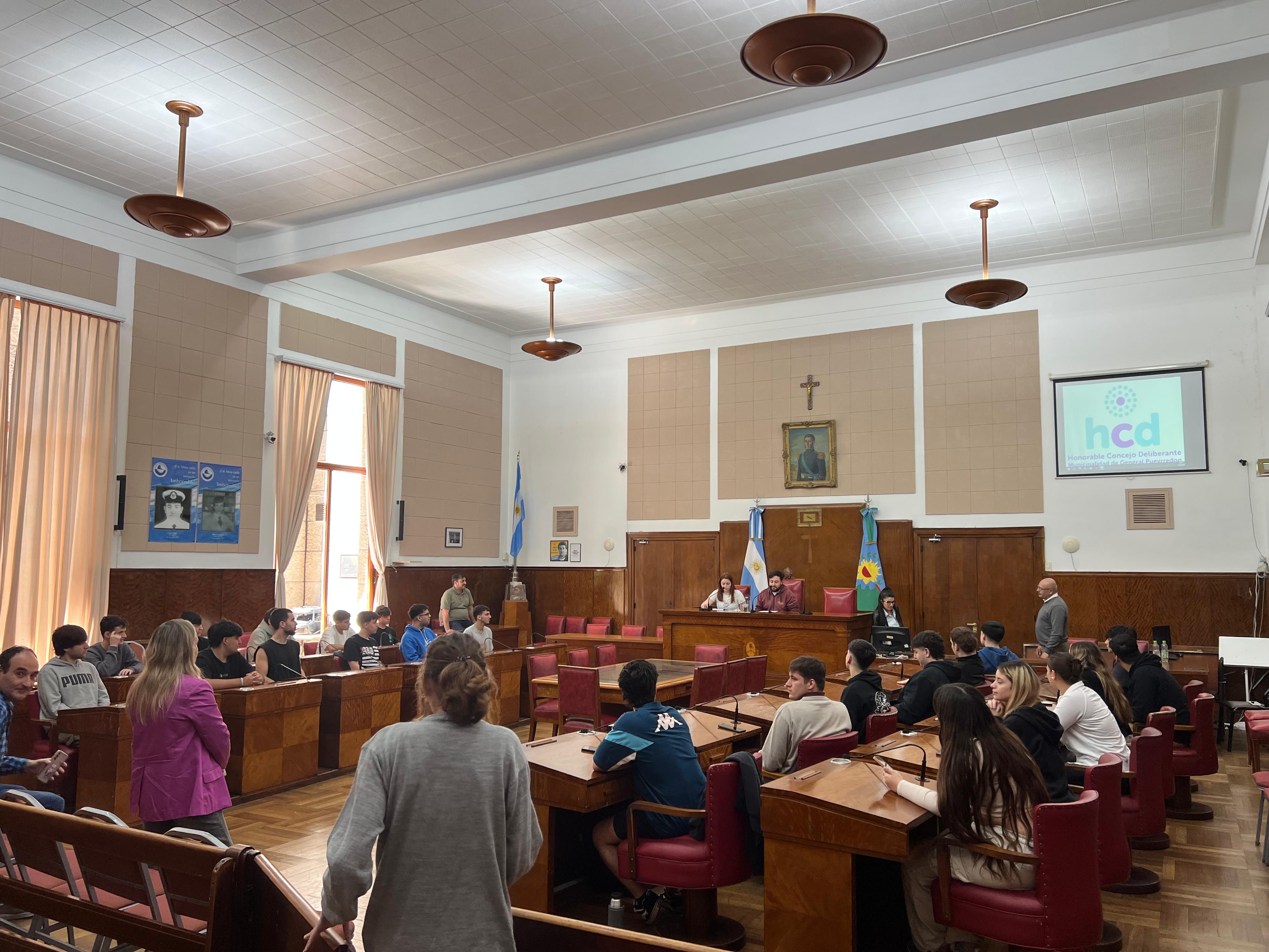 En total, 26 alumnos del 1º año, con el profesor Hernán Kloosterman, estuvieron en el recinto, donde fueron recibidos por el director de Actas, Referencia Legislativa y Digesto, Sebastián Méndez, y por la concejal Cecilia Martínez.