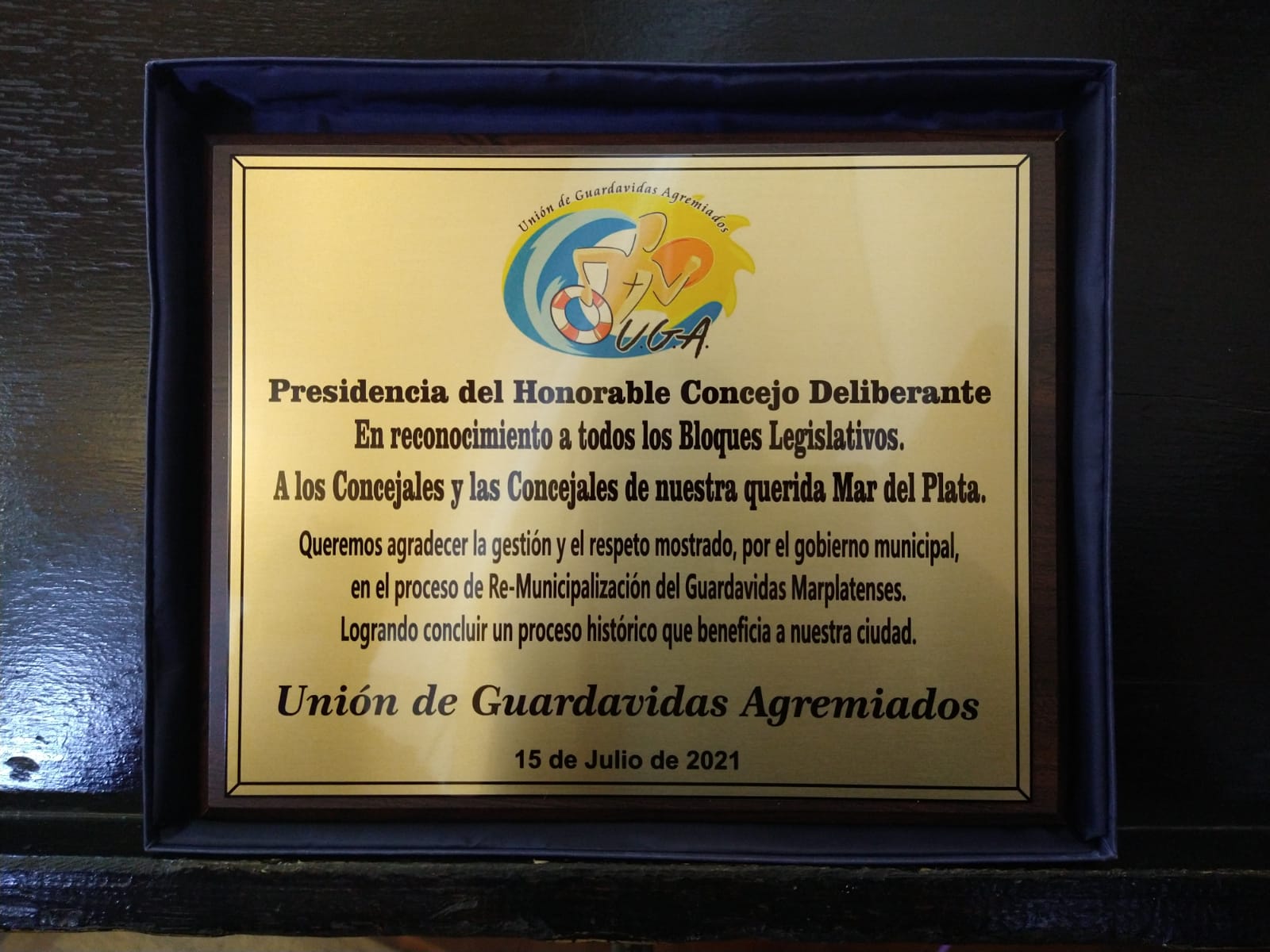 En el marco de un acto protocolar, desarrollado hoy, martes 21 de septiembre, al mediodía, la Unión de Guardavidas Agremiados (UGA) entregó una placa al Honorable Concejo Deliberante de General Pueyrredon, “en reconocimiento al apoyo institucional recibido en el proceso de municipalización del servicio de seguridad en playas”.