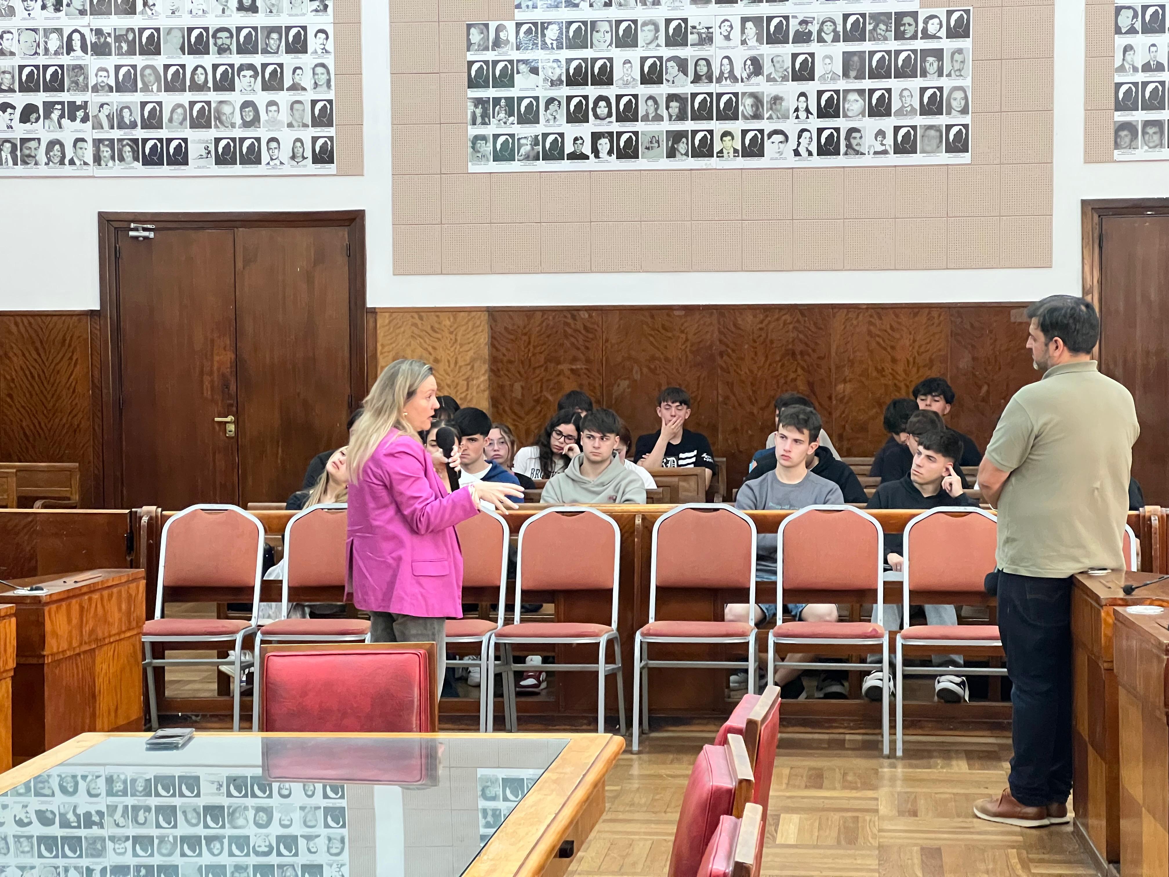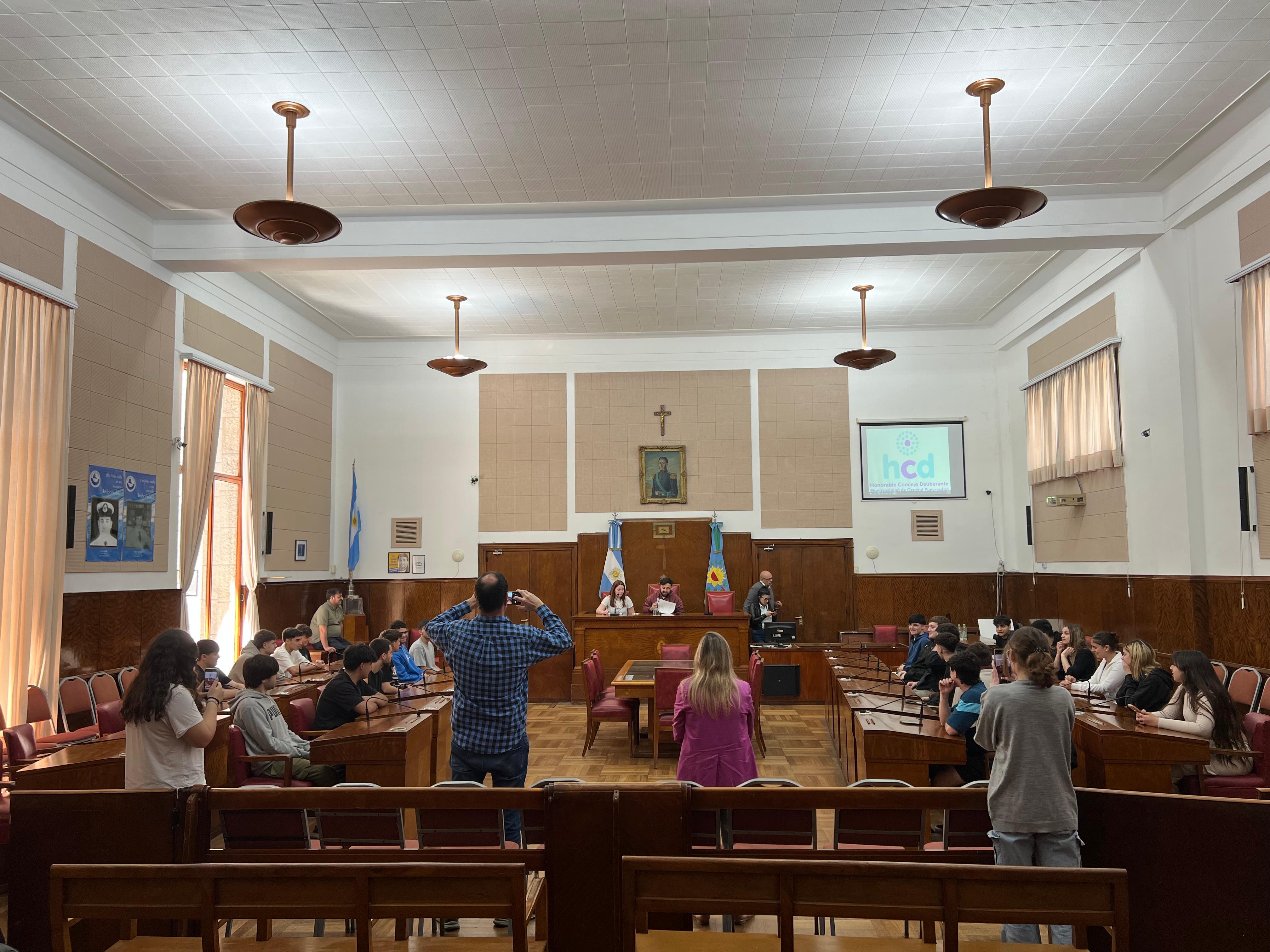 En total, 26 alumnos del 1º año, con el profesor Hernán Kloosterman, estuvieron en el recinto, donde fueron recibidos por el director de Actas, Referencia Legislativa y Digesto, Sebastián Méndez, y por la concejal Cecilia Martínez.